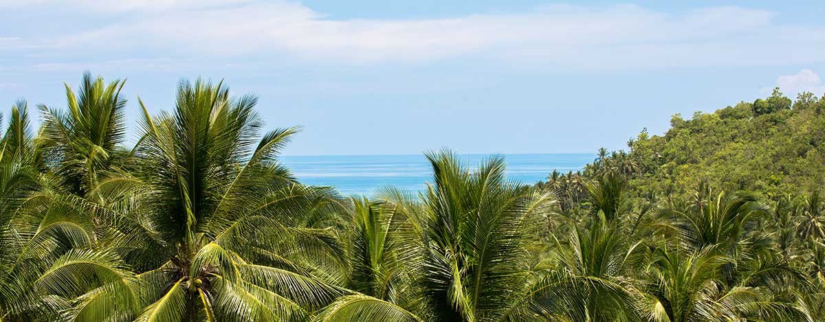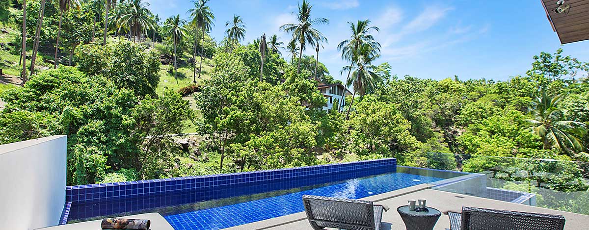 The villa is situated in the lush green hills of southern Koh Samui with fantastic views over towards the palm trees with partial sea views from the spacious open plan living room.
